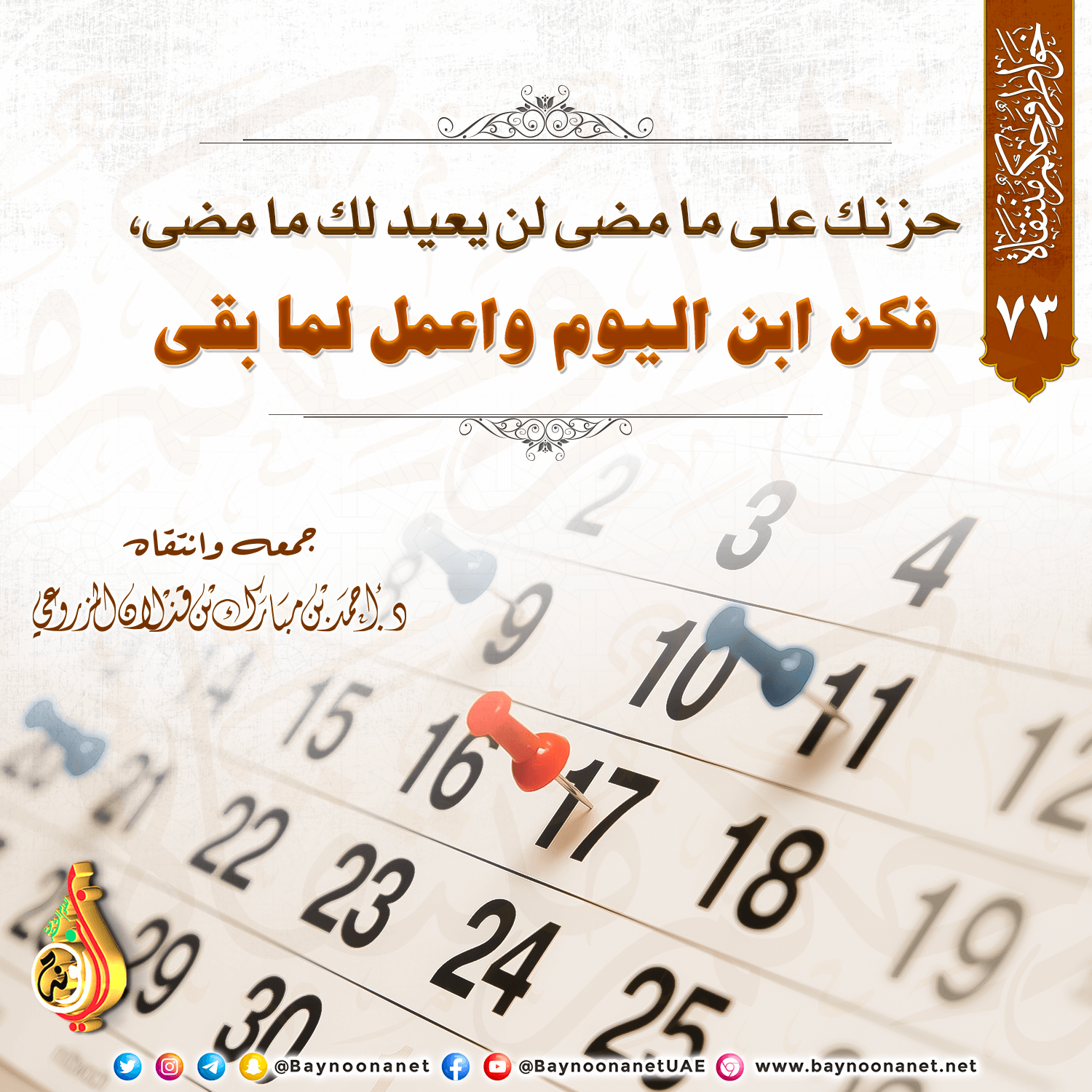 خواطر وحكم منتقاة - (٧٣) حزنك على ما مضى لن يعيد لك ما مضى ... تاريخ الإضافة: الأربعاء, 07/09/2022 - 13:46 التصنيفات صنف البطاقة: الأخلاق والآداب الشيخ: د. أحمد بن مبارك المزروعي سلسلة بطاقات: خواطر وحكم منتقاة حمل السلسلة كاملة: خواطر وحكم منتقاة