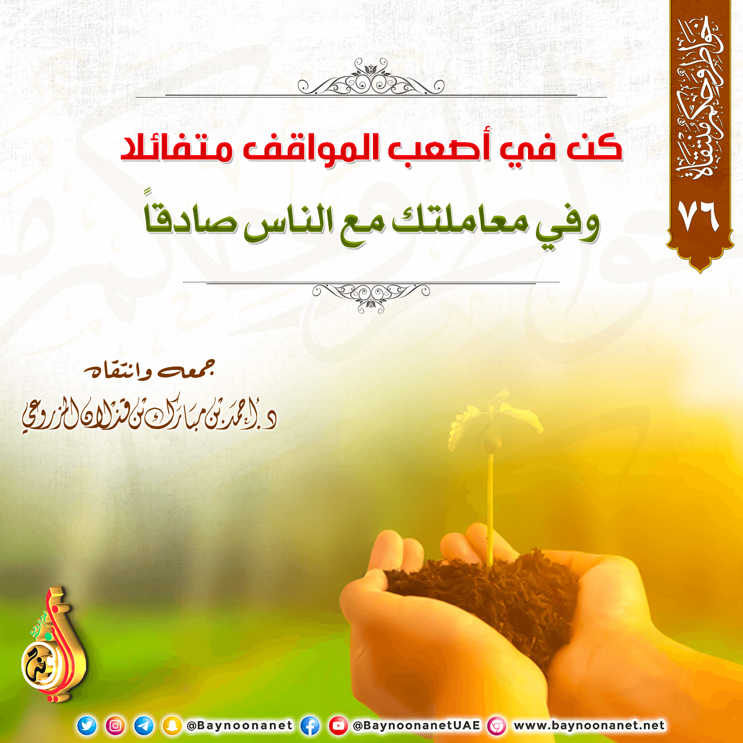 خواطر وحكم منتقاة - (٧٦) كن في أصعب المواقف متفائلا ... تاريخ الإضافة: الإثنين, 12/09/2022 - 20:35 التصنيفات صنف البطاقة: الأخلاق والآداب الشيخ: د. أحمد بن مبارك المزروعي سلسلة بطاقات: خواطر وحكم منتقاة حمل السلسلة كاملة: خواطر وحكم منتقاة