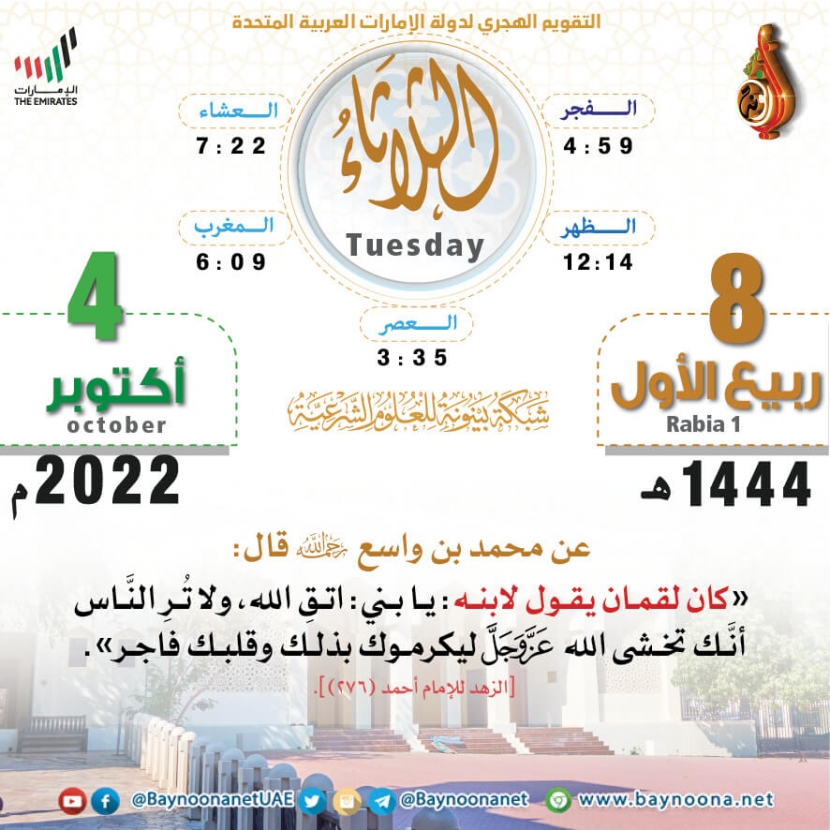 التقويم الهجري لعام ١٤٤٤ هـ - الثلاثاء ٠٨ ربيع الأول تاريخ الإضافة: الإثنين, 03/10/2022 - 21:59 التصنيفات صنف البطاقة: عامة الشيخ: من إعداد شبكة بينونة سلسلة بطاقات: التقويم الهجري لعام ١٤٤٤هـ حمل السلسلة كاملة: التقويم الهجري لعام ١٤٤٤ هـ - شهر المحرم حمل السلسلة كاملة: التقويم الهجري لعام ١٤٤٤ هـ - شهر صفر حمل السلسلة كاملة: التقويم الهجري لعام ١٤٤٤ هـ - شهر ربيع الأول حمل السلسلة كاملة: التقويم الهجري لعام ١٤٤٤ هـ - شهر ربيع الآخر حمل السلسلة كاملة: التقويم الهجري لعام ١٤٤٤ هـ - شهر جمادى الآخرة حمل السلسلة كاملة: التقويم الهجري لعام ١٤٤٤ هـ - شهر شعبان حمل السلسلة كاملة: التقويم الهجري لعام ١٤٤٤ هـ - شهر رمضان حمل السلسلة كاملة: التقويم الهجري لعام ١٤٤٤ هـ - شهر شوال حمل السلسلة كاملة: التقويم الهجري لعام ١٤٤٤ هـ - شهر ذو القعدة حمل السلسلة كاملة: التقويم الهجري لعام ١٤٤٤ هـ - لشهر ذو الحجة