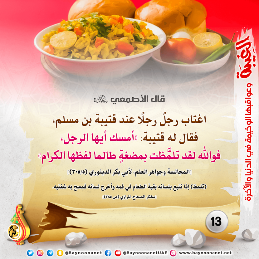 الغيبة وعواقبها الوخيمة في الدنيا والآخرة - (١٣) قال الأصمعي -رحمه الله-: اغتاب رجل رجلا عند قتيبة بن مسلم ... تاريخ الإضافة: السبت, 19/11/2022 - 14:54 التصنيفات صنف البطاقة: الأخلاق والآداب الشيخ: من إعداد شبكة بينونة سلسلة بطاقات: الغيبة وعواقبها الوخيمة في الدنيا والآخرة