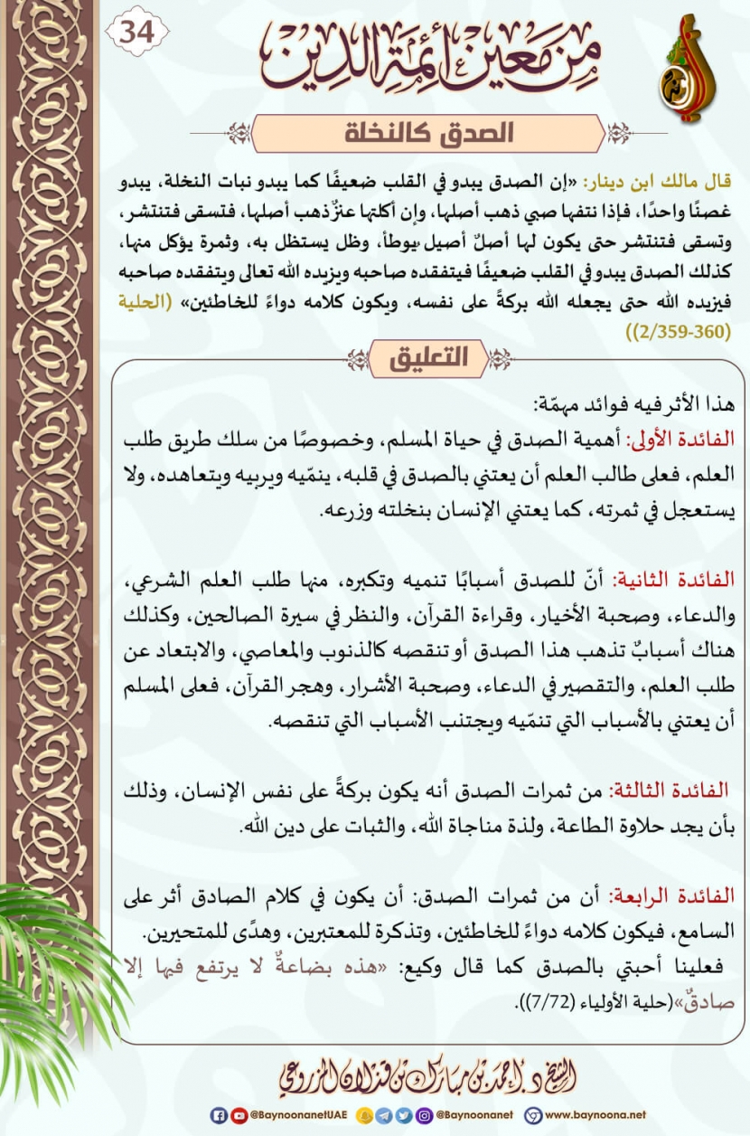 من معين أئمة الدين - (٣٤) الصدق كالنخلة تاريخ الإضافة: الخميس, 22/12/2022 - 14:35 التصنيفات صنف البطاقة: الأخلاق والآداب صنف البطاقة: من آثار السلف الشيخ: د. أحمد بن مبارك المزروعي سلسلة بطاقات: من معين أئمة الدين حمل السلسلة كاملة: من معين أئمة الدين