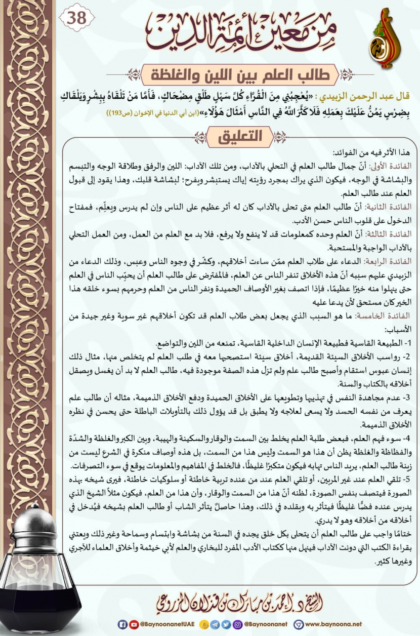 من معين أئمة الدين - (٣٨) طالب العلم بين اللين والغلظة تاريخ الإضافة: الأربعاء, 28/12/2022 - 16:23 التصنيفات صنف البطاقة: الأخلاق والآداب صنف البطاقة: طلب العلم الشيخ: د. أحمد بن مبارك المزروعي سلسلة بطاقات: من معين أئمة الدين حمل السلسلة كاملة: من معين أئمة الدين