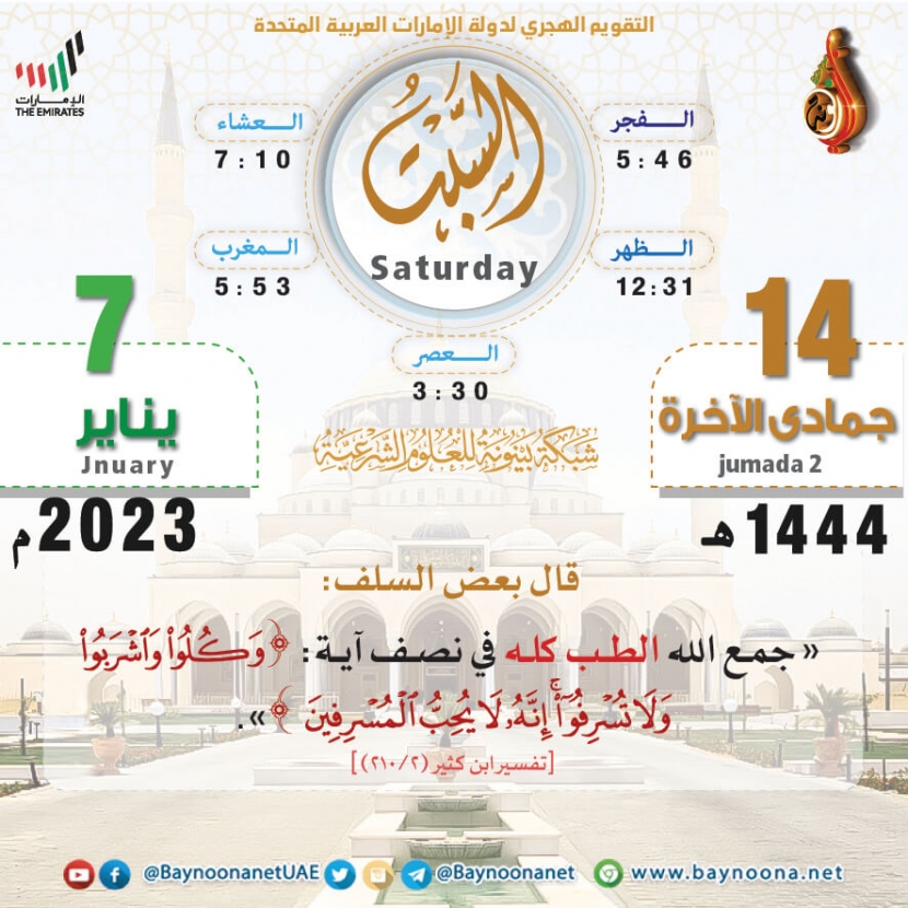 التقويم الهجري لعام ١٤٤٤ هـ - السبت ١٤ جمادى الآخرة تاريخ الإضافة: الجمعة, 06/01/2023 - 21:20 التصنيفات صنف البطاقة: عامة الشيخ: من إعداد شبكة بينونة سلسلة بطاقات: التقويم الهجري لعام ١٤٤٤هـ حمل السلسلة كاملة: التقويم الهجري لعام ١٤٤٤ هـ - شهر المحرم حمل السلسلة كاملة: التقويم الهجري لعام ١٤٤٤ هـ - شهر صفر حمل السلسلة كاملة: التقويم الهجري لعام ١٤٤٤ هـ - شهر ربيع الأول حمل السلسلة كاملة: التقويم الهجري لعام ١٤٤٤ هـ - شهر ربيع الآخر حمل السلسلة كاملة: التقويم الهجري لعام ١٤٤٤ هـ - شهر جمادى الآخرة حمل السلسلة كاملة: التقويم الهجري لعام ١٤٤٤ هـ - شهر شعبان حمل السلسلة كاملة: التقويم الهجري لعام ١٤٤٤ هـ - شهر رمضان حمل السلسلة كاملة: التقويم الهجري لعام ١٤٤٤ هـ - شهر شوال حمل السلسلة كاملة: التقويم الهجري لعام ١٤٤٤ هـ - شهر ذو القعدة حمل السلسلة كاملة: التقويم الهجري لعام ١٤٤٤ هـ - لشهر ذو الحجة