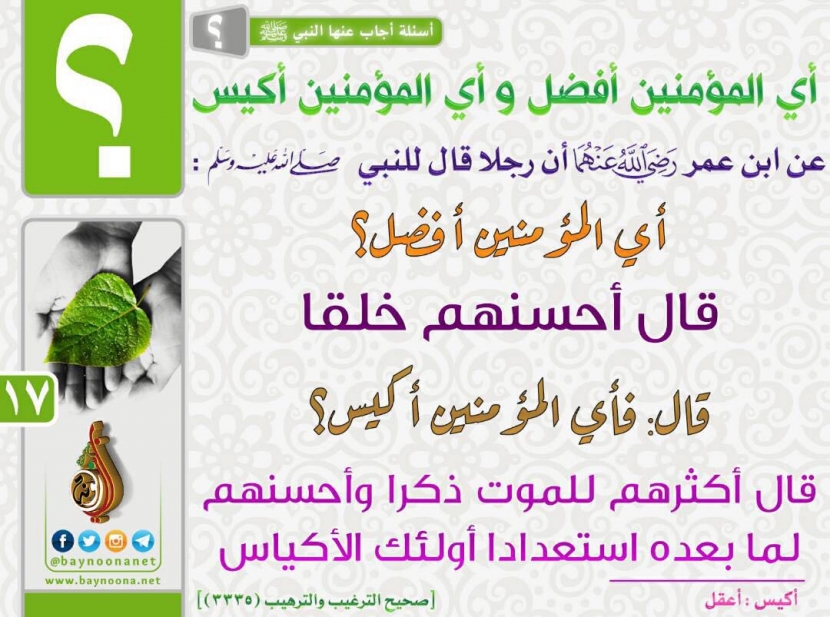 أسئلة أجاب عنها النبي ﷺ: (17) أي المؤمنين أفضل وأي المؤمنين أكيس؟ تاريخ الإضافة: الأحد, 02/07/2017 - 01:58 التصنيفات صنف البطاقة: إيمانيات صنف البطاقة: الأخلاق والآداب سلسلة بطاقات: أسئلة أجاب عنها النبي ﷺ حمل السلسلة كاملة: أسئلة أجاب عنها النبي ﷺ