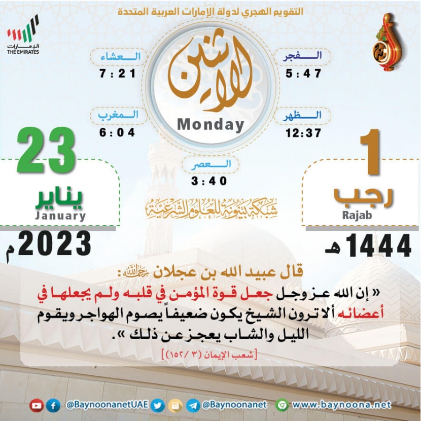 التقويم الهجري لعام ١٤٤٤ هـ - الاثنين ٠١ رجب تاريخ الإضافة: الأحد, 22/01/2023 - 23:44 التصنيفات صنف البطاقة: عامة الشيخ: من إعداد شبكة بينونة سلسلة بطاقات: التقويم الهجري لعام ١٤٤٤هـ حمل السلسلة كاملة: التقويم الهجري لعام ١٤٤٤ هـ - شهر المحرم حمل السلسلة كاملة: التقويم الهجري لعام ١٤٤٤ هـ - شهر صفر حمل السلسلة كاملة: التقويم الهجري لعام ١٤٤٤ هـ - شهر ربيع الأول حمل السلسلة كاملة: التقويم الهجري لعام ١٤٤٤ هـ - شهر ربيع الآخر حمل السلسلة كاملة: التقويم الهجري لعام ١٤٤٤ هـ - شهر جمادى الآخرة حمل السلسلة كاملة: التقويم الهجري لعام ١٤٤٤ هـ - شهر شعبان حمل السلسلة كاملة: التقويم الهجري لعام ١٤٤٤ هـ - شهر رمضان حمل السلسلة كاملة: التقويم الهجري لعام ١٤٤٤ هـ - شهر شوال حمل السلسلة كاملة: التقويم الهجري لعام ١٤٤٤ هـ - شهر ذو القعدة حمل السلسلة كاملة: التقويم الهجري لعام ١٤٤٤ هـ - لشهر ذو الحجة