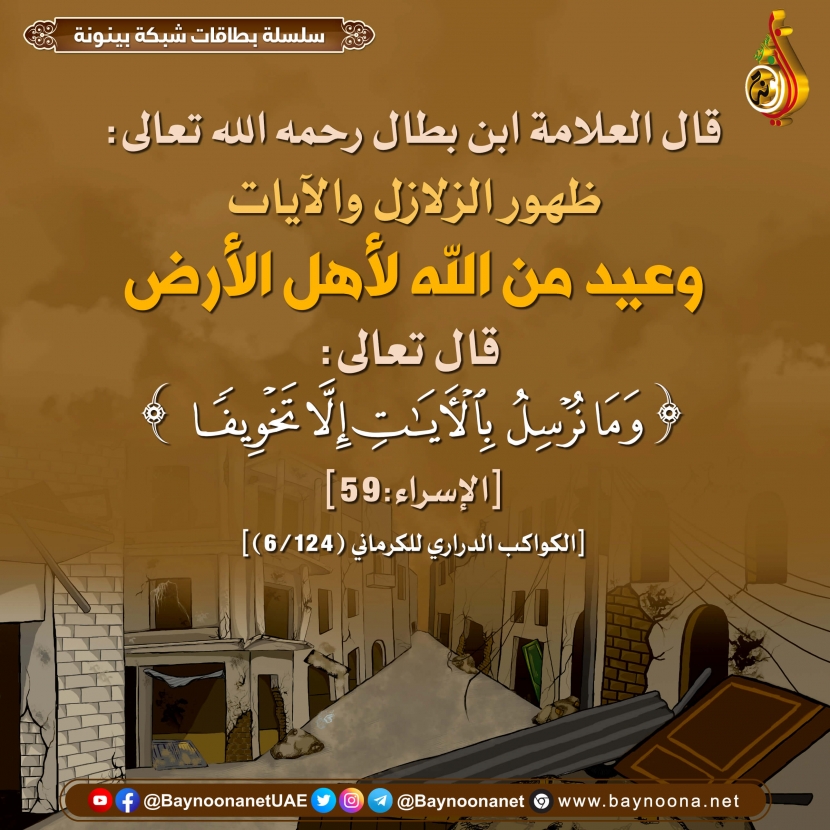 قال العلامة ابن بطال رحمه الله: ظهور الزلازل والآيات وعيد من الله ... تاريخ الإضافة: السبت, 11/02/2023 - 17:03 التصنيفات صنف البطاقة: إيمانيات الشيخ: من إعداد شبكة بينونة