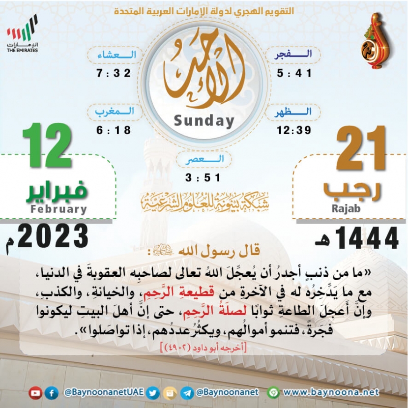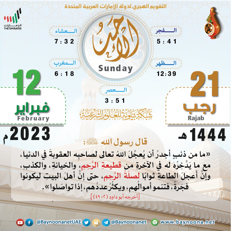 التقويم الهجري لعام ١٤٤٤ هـ - الأحد ٢١ رجب تاريخ الإضافة: السبت, 11/02/2023 - 22:32 التصنيفات صنف البطاقة: عامة الشيخ: من إعداد شبكة بينونة سلسلة بطاقات: التقويم الهجري لعام ١٤٤٤هـ حمل السلسلة كاملة: التقويم الهجري لعام ١٤٤٤ هـ - شهر المحرم حمل السلسلة كاملة: التقويم الهجري لعام ١٤٤٤ هـ - شهر صفر حمل السلسلة كاملة: التقويم الهجري لعام ١٤٤٤ هـ - شهر ربيع الأول حمل السلسلة كاملة: التقويم الهجري لعام ١٤٤٤ هـ - شهر ربيع الآخر حمل السلسلة كاملة: التقويم الهجري لعام ١٤٤٤ هـ - شهر جمادى الآخرة حمل السلسلة كاملة: التقويم الهجري لعام ١٤٤٤ هـ - شهر شعبان حمل السلسلة كاملة: التقويم الهجري لعام ١٤٤٤ هـ - شهر رمضان حمل السلسلة كاملة: التقويم الهجري لعام ١٤٤٤ هـ - شهر شوال حمل السلسلة كاملة: التقويم الهجري لعام ١٤٤٤ هـ - شهر ذو القعدة حمل السلسلة كاملة: التقويم الهجري لعام ١٤٤٤ هـ - لشهر ذو الحجة