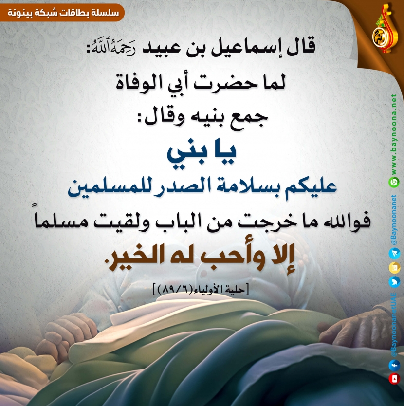 قال إسماعيل ابن عبيد رحمه الله: لما حضرت أبي الوفات جمع بنيه وقال: ( يا بني عليكم بسلامة الصدر للمسلمين ... ) تاريخ الإضافة: الخميس, 23/02/2023 - 15:31 التصنيفات صنف البطاقة: إيمانيات صنف البطاقة: الأخلاق والآداب الشيخ: من إعداد شبكة بينونة