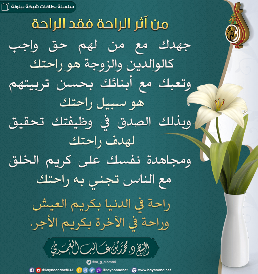 من آثر الراحة فقد الراحة تاريخ الإضافة: الإثنين, 08/05/2023 - 21:09 التصنيفات صنف البطاقة: الأخلاق والآداب الشيخ: د. محمد بن غالب العمري