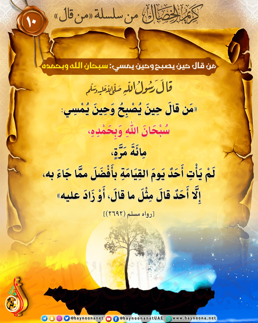 كريم الخصال من سلسلة ( من قال ) - (١٠) من قال حين يصبح وحين يمسي: سبحان الله وبحمده ... تاريخ الإضافة: الجمعة, 19/05/2023 - 21:30 التصنيفات صنف البطاقة: الأدعية والأذكار الشيخ: من إعداد شبكة بينونة سلسلة بطاقات: كريم الخصال من سلسلة ( من قال ) حمل السلسلة كاملة: كريم الخصال من سلسلة ( من قال )