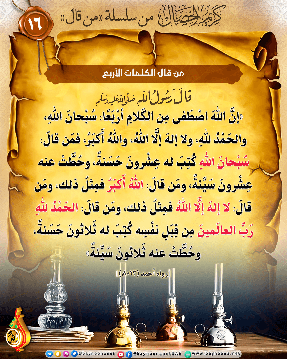 كريم الخصال من سلسلة ( من قال ) - (١٦) من قال الكلمات الأربع تاريخ الإضافة: الخميس, 25/05/2023 - 13:31 التصنيفات صنف البطاقة: الأدعية والأذكار الشيخ: من إعداد شبكة بينونة سلسلة بطاقات: كريم الخصال من سلسلة ( من قال ) حمل السلسلة كاملة: كريم الخصال من سلسلة ( من قال )