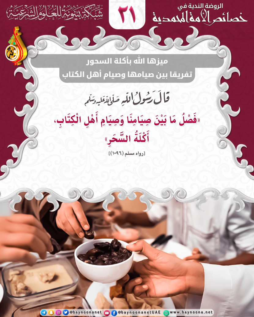الروضة الندية في خصائص الأمة المحمدية - (٢١) ميزها الله بأكلة السحور... تاريخ الإضافة: الإثنين, 24/07/2023 - 14:43 التصنيفات صنف البطاقة: إيمانيات الشيخ: من إعداد شبكة بينونة سلسلة بطاقات: الروضة الندية في خصائص الأمة المحمدية حمل السلسلة كاملة: الروضة الندية في خصائص الأمة المحمدية