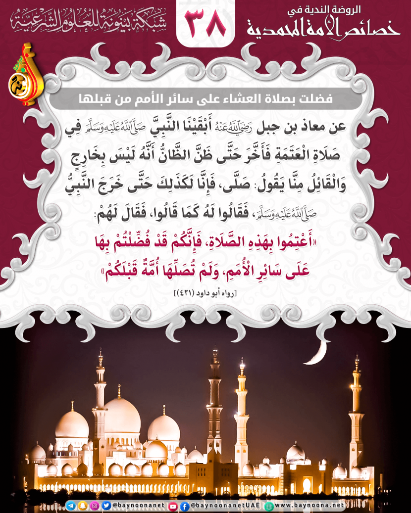 الروضة الندية في خصائص الأمة المحمدية - (٣٨) فضلت بصلاة العشاء على سائر الأمم من قبلها تاريخ الإضافة: الأحد, 13/08/2023 - 21:35 التصنيفات صنف البطاقة: إيمانيات الشيخ: من إعداد شبكة بينونة سلسلة بطاقات: الروضة الندية في خصائص الأمة المحمدية حمل السلسلة كاملة: الروضة الندية في خصائص الأمة المحمدية
