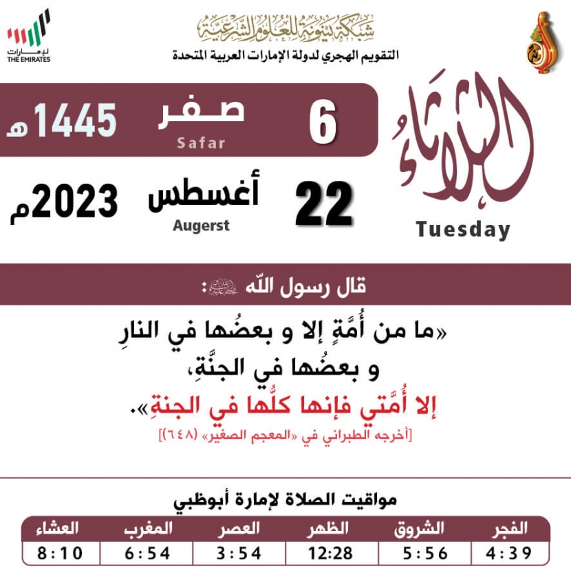 التقويم الهجري لعام ١٤٤٥ هـ - الثلاثاء ٠٦ صفر تاريخ الإضافة: الثلاثاء, 22/08/2023 - 00:35 التصنيفات صنف البطاقة: عامة الشيخ: من إعداد شبكة بينونة سلسلة بطاقات: التقويم الهجري لعام ١٤٤٥هـ حمل السلسلة كاملة: التقويم الهجري لعام ١٤٤٥ هـ - شهر المحرم حمل السلسلة كاملة: التقويم الهجري لعام ١٤٤٥ هـ - شهر صفر حمل السلسلة كاملة: التقويم الهجري لعام ١٤٤٥ هـ - شهر ربيع الأول حمل السلسلة كاملة: التقويم الهجري لعام ١٤٤٥ هـ - شهر ربيع الثاني حمل السلسلة كاملة: التقويم الهجري لعام ١٤٤٥ هـ - شهر جمادى الأولى حمل السلسلة كاملة: التقويم الهجري لعام ١٤٤٥ هـ - شهر جمادى الآخرة