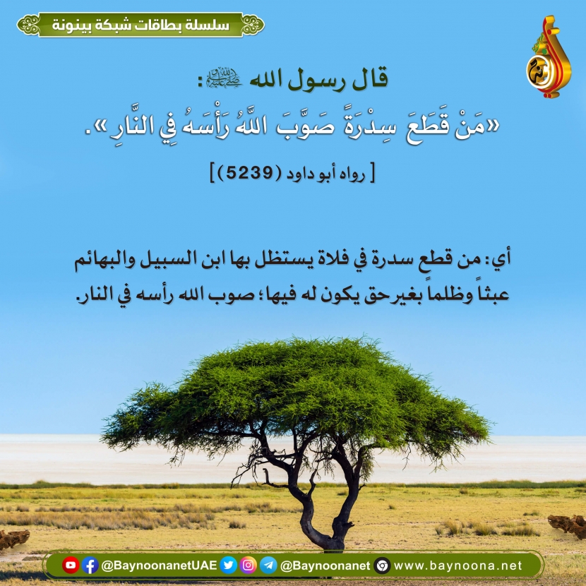 قال رسول الله ﷺ: ( من قطع سدرة صوب الله رأسه في النار ) تاريخ الإضافة: الثلاثاء, 29/08/2023 - 21:47 التصنيفات صنف البطاقة: إيمانيات صنف البطاقة: الأخلاق والآداب الشيخ: من إعداد شبكة بينونة