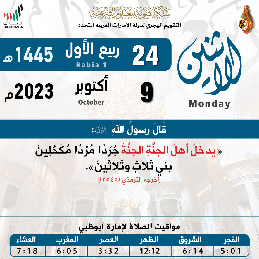 التقويم الهجري لعام ١٤٤٥ هـ - الاثنين ٢٤ ربيع الأول تاريخ الإضافة: الإثنين, 09/10/2023 - 00:01 التصنيفات صنف البطاقة: عامة الشيخ: من إعداد شبكة بينونة سلسلة بطاقات: التقويم الهجري لعام ١٤٤٥هـ حمل السلسلة كاملة: التقويم الهجري لعام ١٤٤٥ هـ - شهر المحرم حمل السلسلة كاملة: التقويم الهجري لعام ١٤٤٥ هـ - شهر صفر حمل السلسلة كاملة: التقويم الهجري لعام ١٤٤٥ هـ - شهر ربيع الأول حمل السلسلة كاملة: التقويم الهجري لعام ١٤٤٥ هـ - شهر ربيع الثاني حمل السلسلة كاملة: التقويم الهجري لعام ١٤٤٥ هـ - شهر جمادى الأولى حمل السلسلة كاملة: التقويم الهجري لعام ١٤٤٥ هـ - شهر جمادى الآخرة