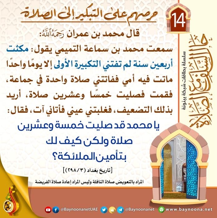 حال السلف مع الصلاة - (١٤) حرصهم على التبكير إلى الصلاة تاريخ الإضافة: الأحد, 15/10/2023 - 20:28 التصنيفات صنف البطاقة: إيمانيات صنف البطاقة: العبادات صنف البطاقة: من آثار السلف الشيخ: من إعداد شبكة بينونة سلسلة بطاقات: حال السلف مع الصلاة حمل السلسلة كاملة: حال السلف مع الصلاة