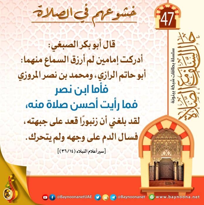 حال السلف مع الصلاة - (٤٧) خشوعهم في الصلاة تاريخ الإضافة: السبت, 18/11/2023 - 13:05 التصنيفات صنف البطاقة: من آثار السلف الشيخ: من إعداد شبكة بينونة سلسلة بطاقات: حال السلف مع الصلاة حمل السلسلة كاملة: حال السلف مع الصلاة