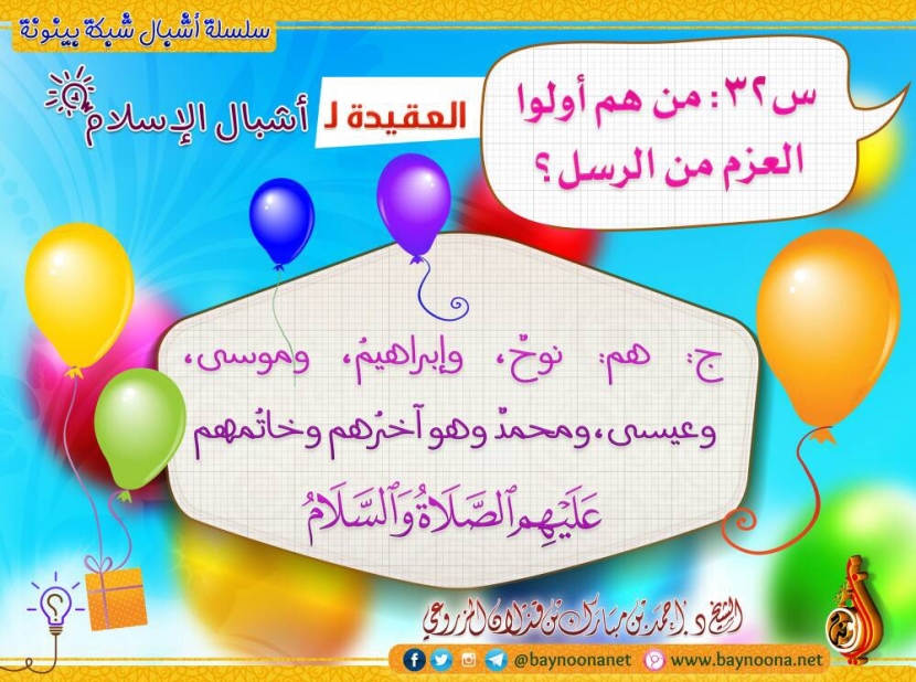 العقيدة لأشبال الإسلام - (س32) : من هم أولوا العزم من الرسل؟ تاريخ الإضافة: السبت, 05/08/2017 - 12:12 التصنيفات صنف البطاقة: إيمانيات سلسلة بطاقات: العقيدة لأشبال الإسلام حمل السلسلة كاملة: العقيدة لأشبال الإسلام