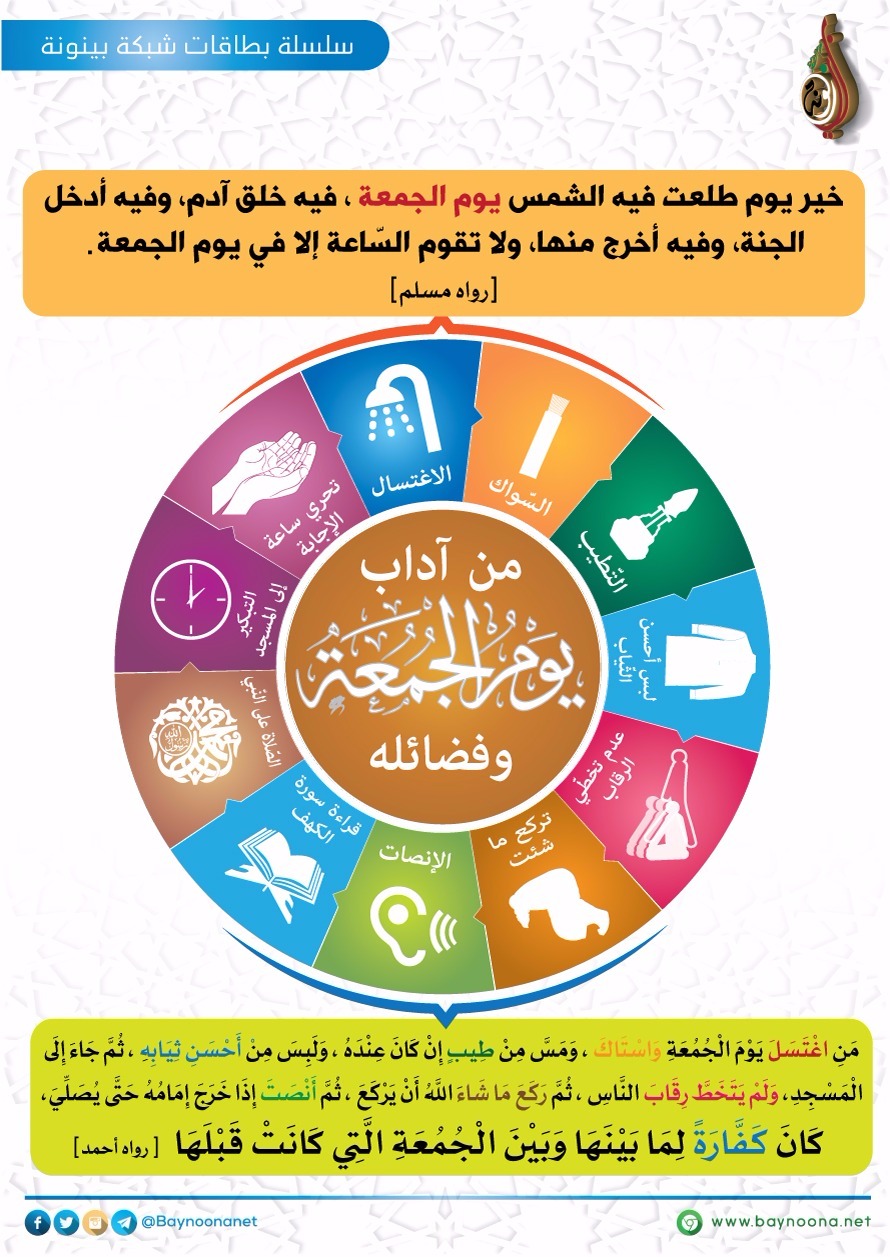 من آداب يوم الجمعة وفضائله تاريخ الإضافة: الثلاثاء, 22/03/2016 - 12:50 التصنيفات صنف البطاقة: عامة صنف البطاقة: الأخلاق والآداب