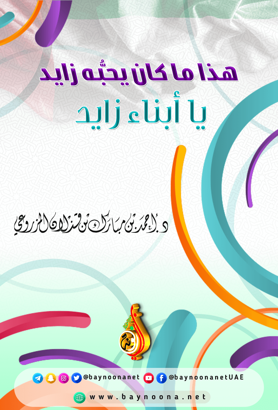 هذا ما كان يحبه زايد يا أبناء زايد تاريخ الإضافة: الأحد, 01/11/2020 - 14:04 التصنيفات الشيخ: د. أحمد بن مبارك المزروعي القسم: حب الوطن القسم: معاملة الحكام سلسلة بطاقات: هذا ما كان يحبه زايد يا أبناء زايد المرفقالحجم حمّل: هذا ما كان يحبه زايد يا أبناء زايد1.54 م.بايت ▸ هذا ما كان يحبه زايد يا أبناء زايد فوق هذا ما كان يحبه زايد يا أبناء زايد ◂