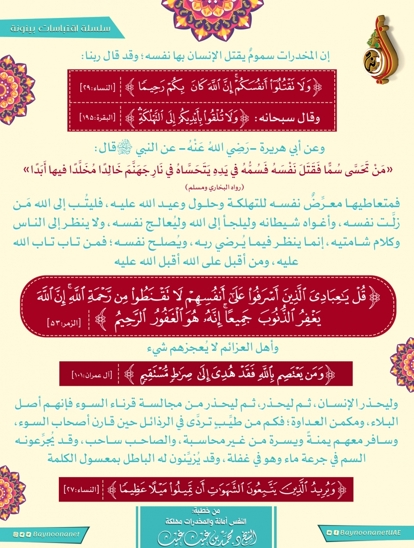 إن المخدرات سموم يقتل الانسان بها نفسه تاريخ الإضافة: الإثنين, 17/02/2020 - 17:26 التصنيفات الشيخ: د. محمد بن غيث غيث