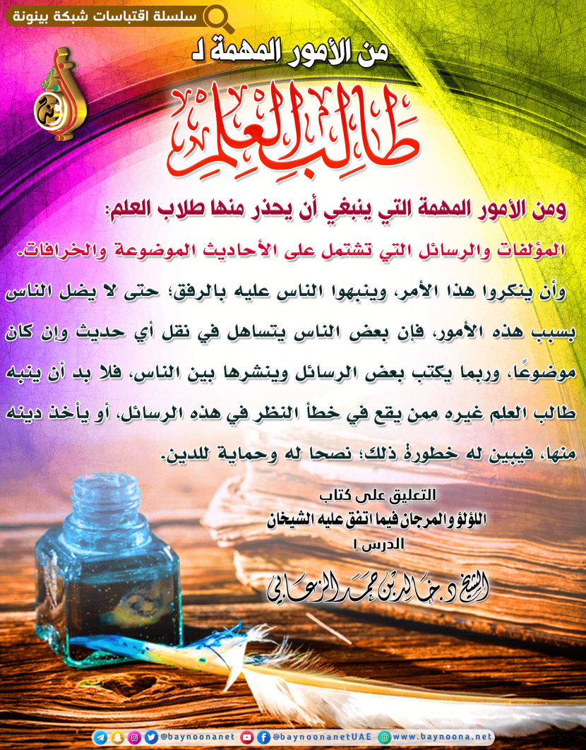 من الأمور المهمة لطالب العلم - أن يحذر من المؤلفات والرسائل التي تشتمل على الأحاديث الموضوعة والخرافات ... تاريخ الإضافة: الأربعاء, 26/02/2020 - 18:30 التصنيفات الشيخ: د. خالد بن حمد الزعابي