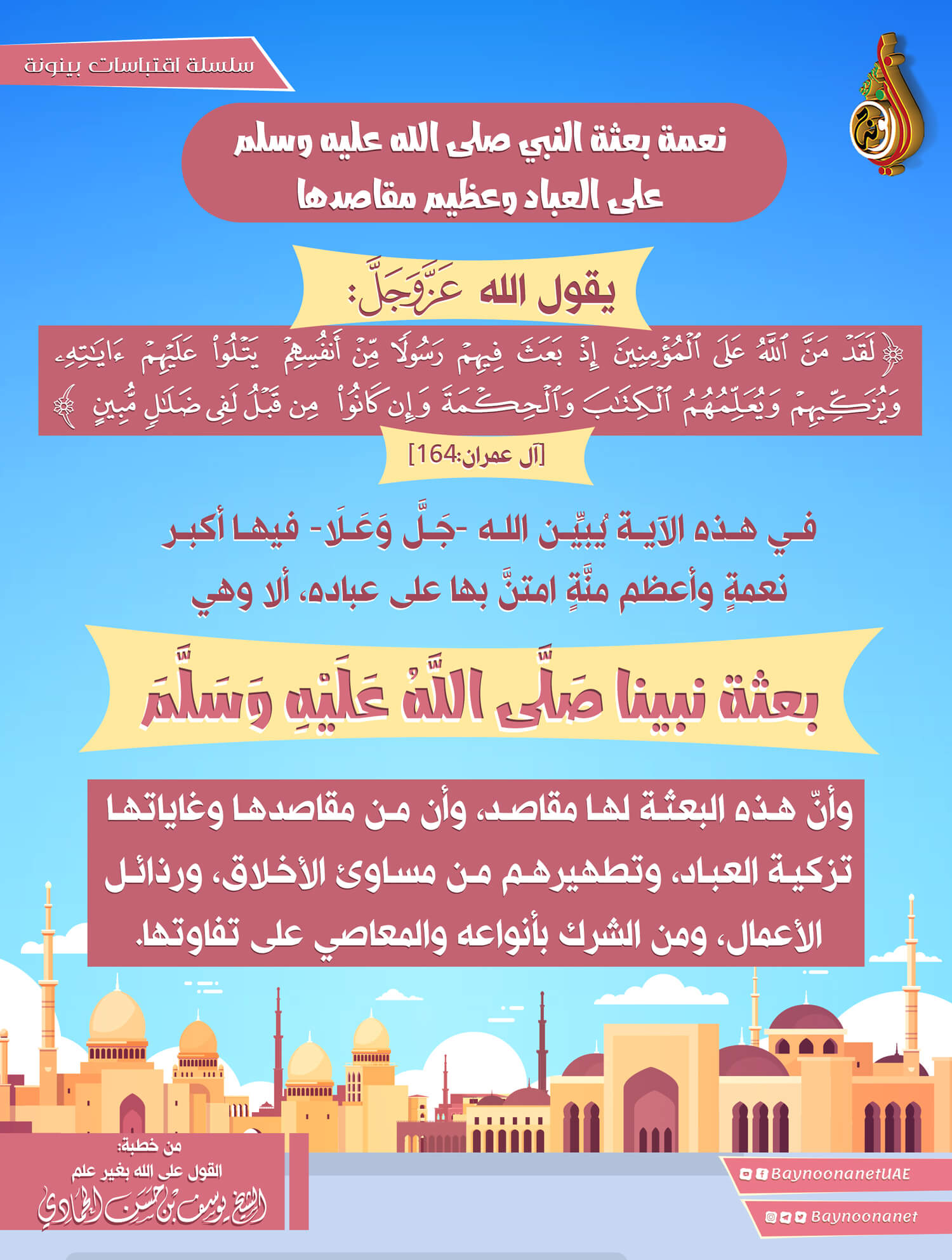 نعمة بعثة النبي ﷺ على العباد وعظيم مقاصده تاريخ الإضافة: الثلاثاء, 31/03/2020 - 17:38 التصنيفات الشيخ: يوسف بن حسن الحمادي