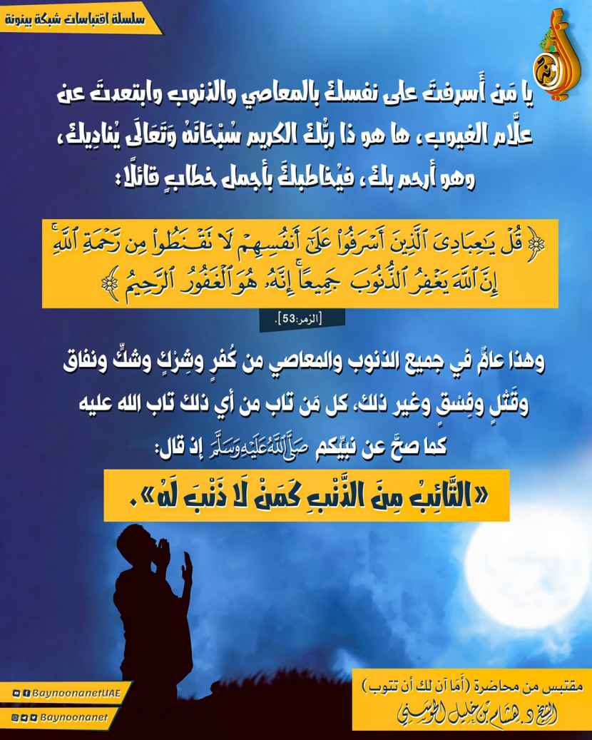 يا من أسرفت على نفسك بالمعاصي والذنوب ... تاريخ الإضافة: السبت, 13/06/2020 - 18:33 التصنيفات الشيخ: د. هشام بن خليل الحوسني
