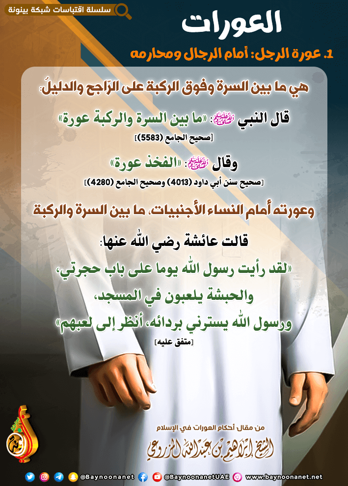العورات - (٠١) عورة الرجل أمام الرجال ومحارمه تاريخ الإضافة: الثلاثاء, 09/11/2021 - 00:02 التصنيفات الشيخ: إبراهيم بن عبد الله المزروعي