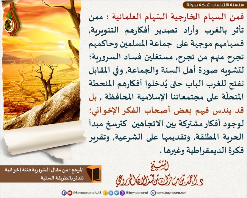 فمن السهام الخارجية، السهام العلمانية... تاريخ الإضافة: الأربعاء, 03/04/2019 - 14:29 التصنيفات الشيخ: د. أحمد بن مبارك المزروعي