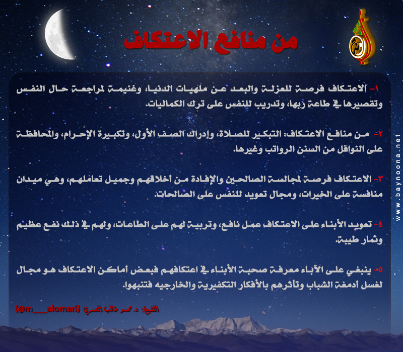 من منافع الاعتكاف تاريخ الإضافة: الأربعاء, 15/07/2015 - 16:35 التصنيفات الشيخ: د. محمد بن غالب العمري