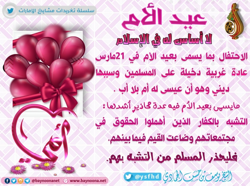 عيد الأم لا أساس له في الإسلام تاريخ الإضافة: الثلاثاء, 21/03/2017 - 00:28 التصنيفات الشيخ: يوسف بن حسن الحمادي