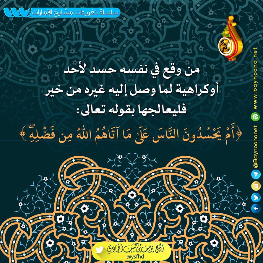 من وقع في نفسه حسد لأحد أوكراهية لما وصل إليه غيره من خير... تاريخ الإضافة: الثلاثاء, 21/11/2017 - 13:40 التصنيفات الشيخ: يوسف بن حسن الحمادي