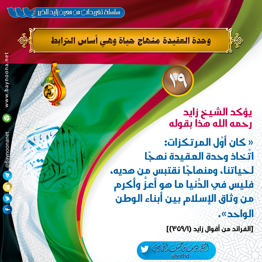 من معين زايد الخير - (19) وحدة العقيدة منهاج حياة وهي أساس الترابط تاريخ الإضافة: السبت, 10/03/2018 - 11:26 التصنيفات الشيخ: يوسف بن حسن الحمادي سلسلة تغريدات: من معين زايد الخير