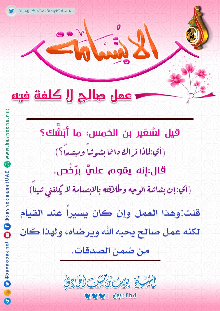 الابتسامة عمل صالح لا كلفة فيه... تاريخ الإضافة: الأربعاء, 05/12/2018 - 14:42 التصنيفات الشيخ: يوسف بن حسن الحمادي