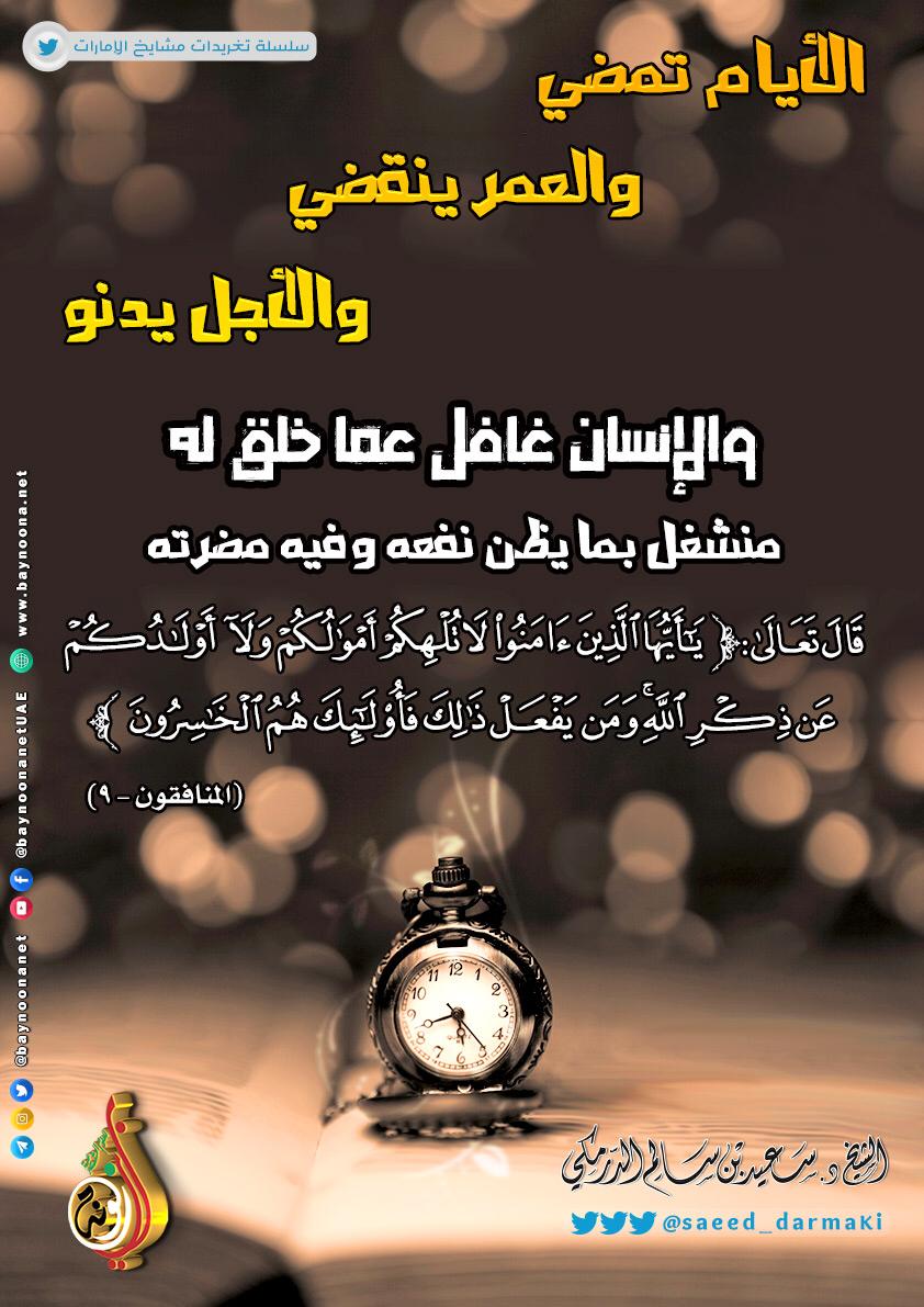 الأيام يمضي والعمر ينقضي، والأجل يدنو، والإنسان غافل عما خلق له... تاريخ الإضافة: الأربعاء, 06/02/2019 - 12:21 التصنيفات الشيخ: د. سعيد بن سالم الدرمكي
