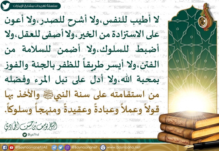 لا أطيب للنفس، ولا أشرح للصدر،...، ولا أدل على نبل المرء وفضله من استقامته على سنة النبي ﷺ... تاريخ الإضافة: الإثنين, 04/03/2019 - 17:20 التصنيفات الشيخ: يوسف بن حسن الحمادي