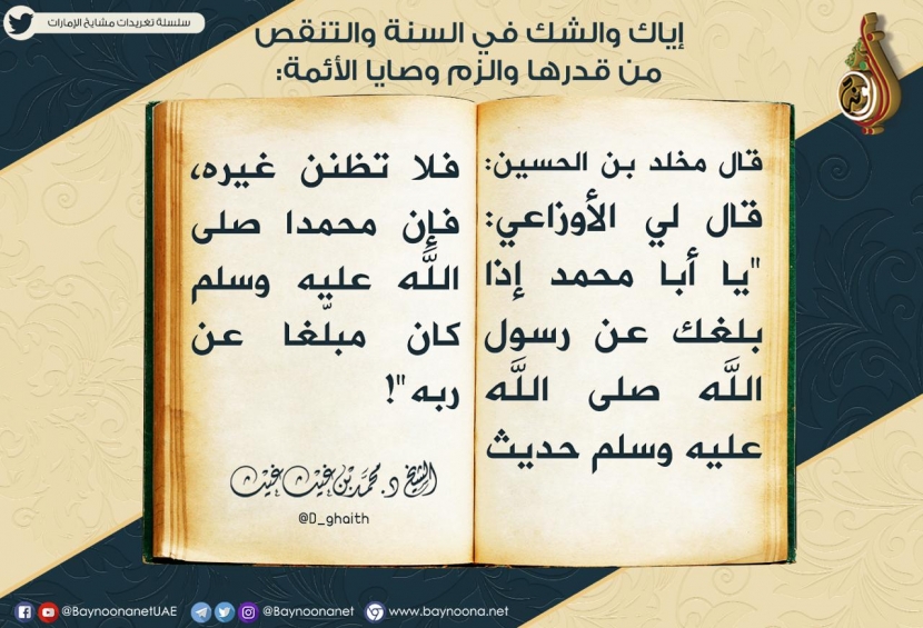 إياك والشك في السنة والتنقص من قدرها، والزم وصايا الأئمة تاريخ الإضافة: الثلاثاء, 05/03/2019 - 19:22 التصنيفات الشيخ: د. محمد بن غيث غيث