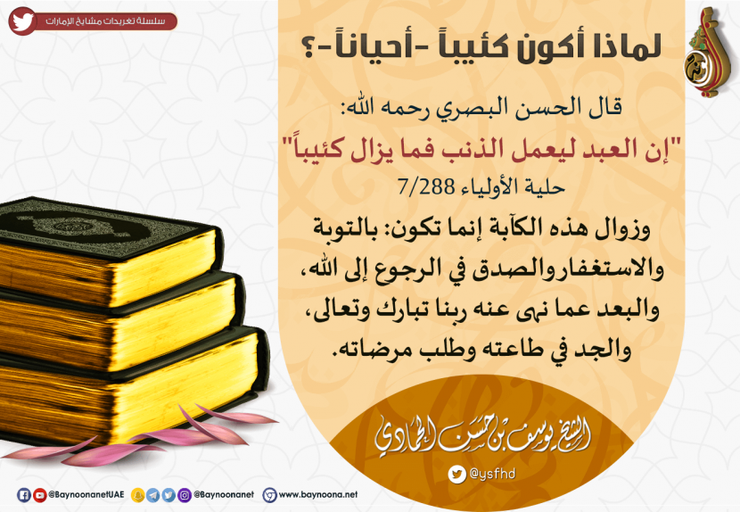 لماذا أكون كئيبا -أحيانا- ؟ تاريخ الإضافة: الإثنين, 26/08/2019 - 16:15 التصنيفات الشيخ: يوسف بن حسن الحمادي