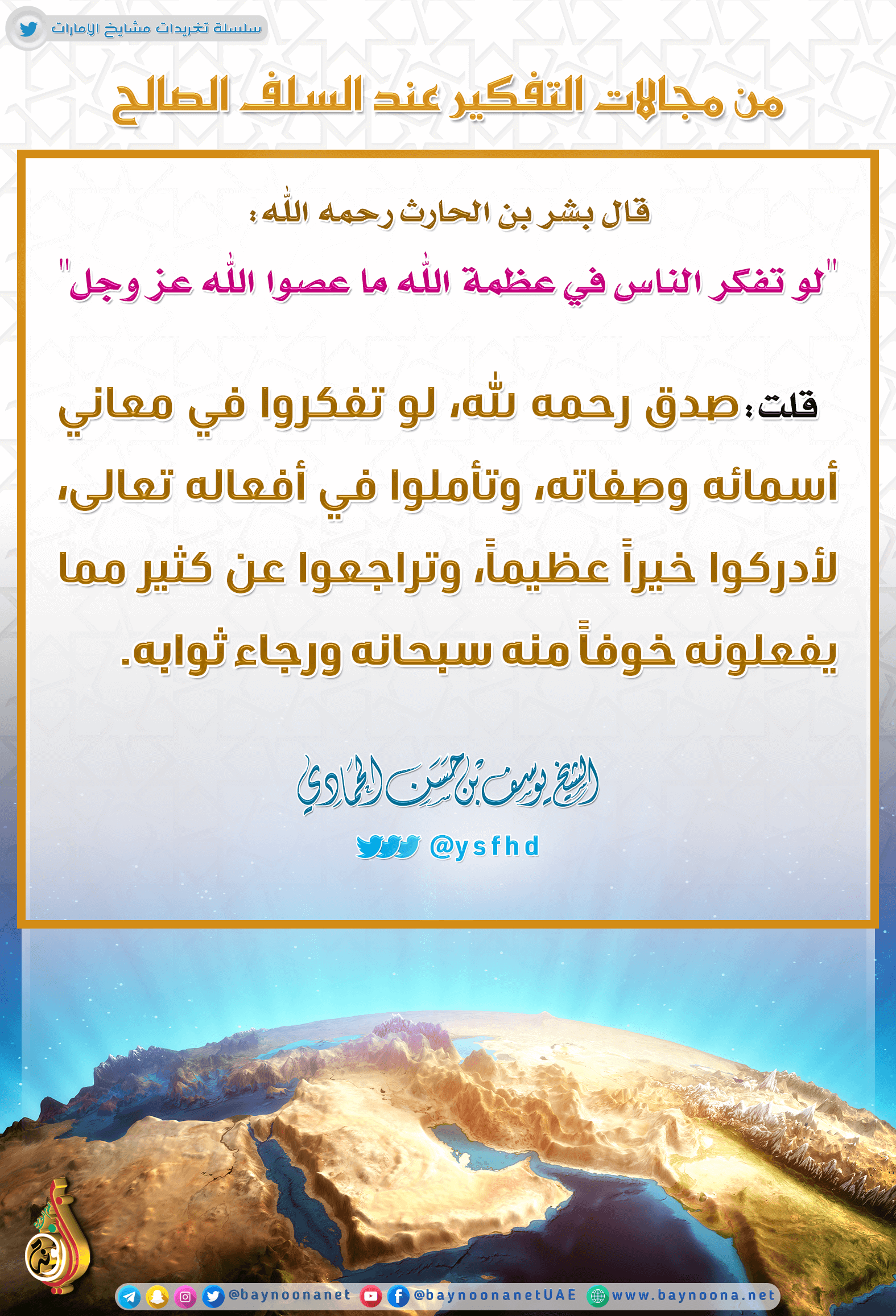 من مجالات التفكير عند السلف الصالح تاريخ الإضافة: الثلاثاء, 27/08/2019 - 13:27 التصنيفات الشيخ: يوسف بن حسن الحمادي