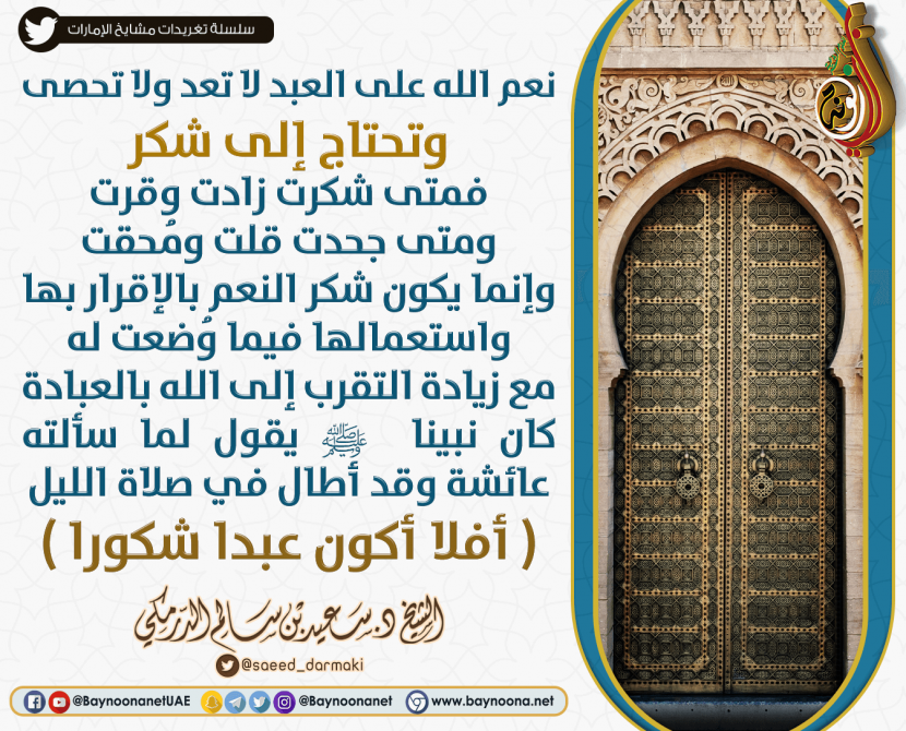 نعم الله على العبد لا تعد ولا تحصى، وتحتاج إلى شكر... تاريخ الإضافة: الأحد, 06/10/2019 - 13:17 التصنيفات الشيخ: د. سعيد بن سالم الدرمكي