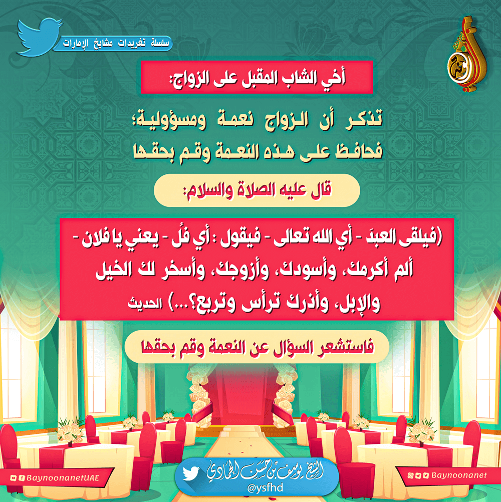 أخي الشاب المقبل على الزواج: تذكر أن الزواج نعمة ومسؤولية ... تاريخ الإضافة: الأحد, 15/03/2020 - 14:53 التصنيفات الشيخ: يوسف بن حسن الحمادي