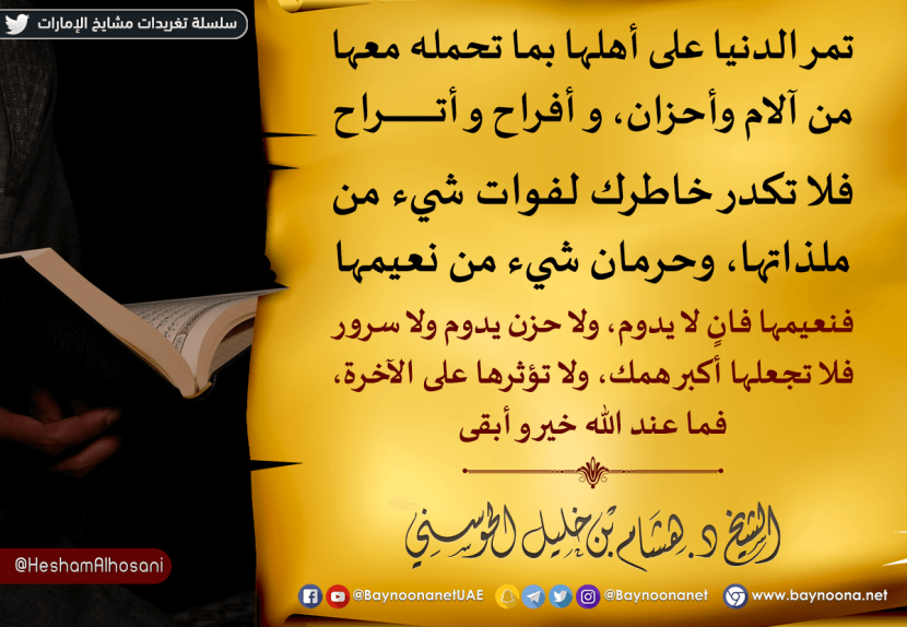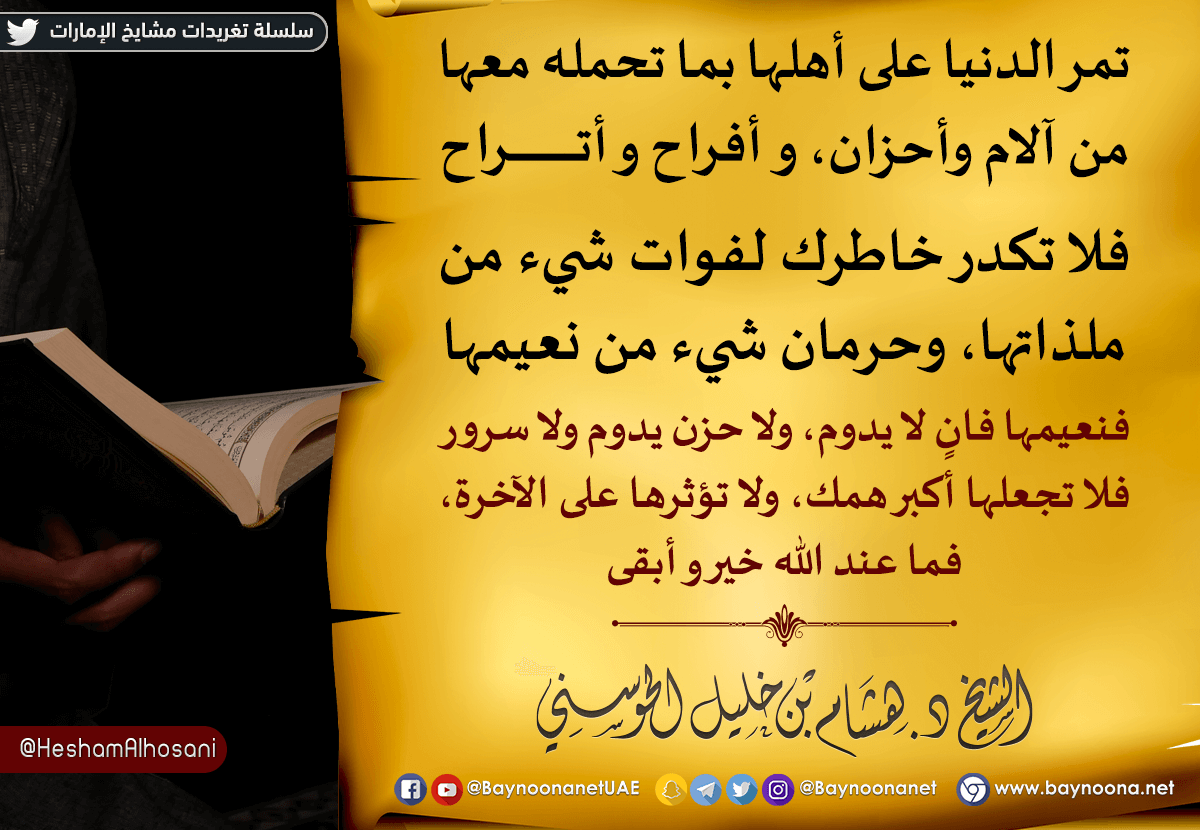 تمر الدنيا على أهلها بما تحمله معها من آلام وأحزان ، وأفراح وأتراح ... تاريخ الإضافة: الثلاثاء, 14/07/2020 - 15:00 التصنيفات الشيخ: د. هشام بن خليل الحوسني