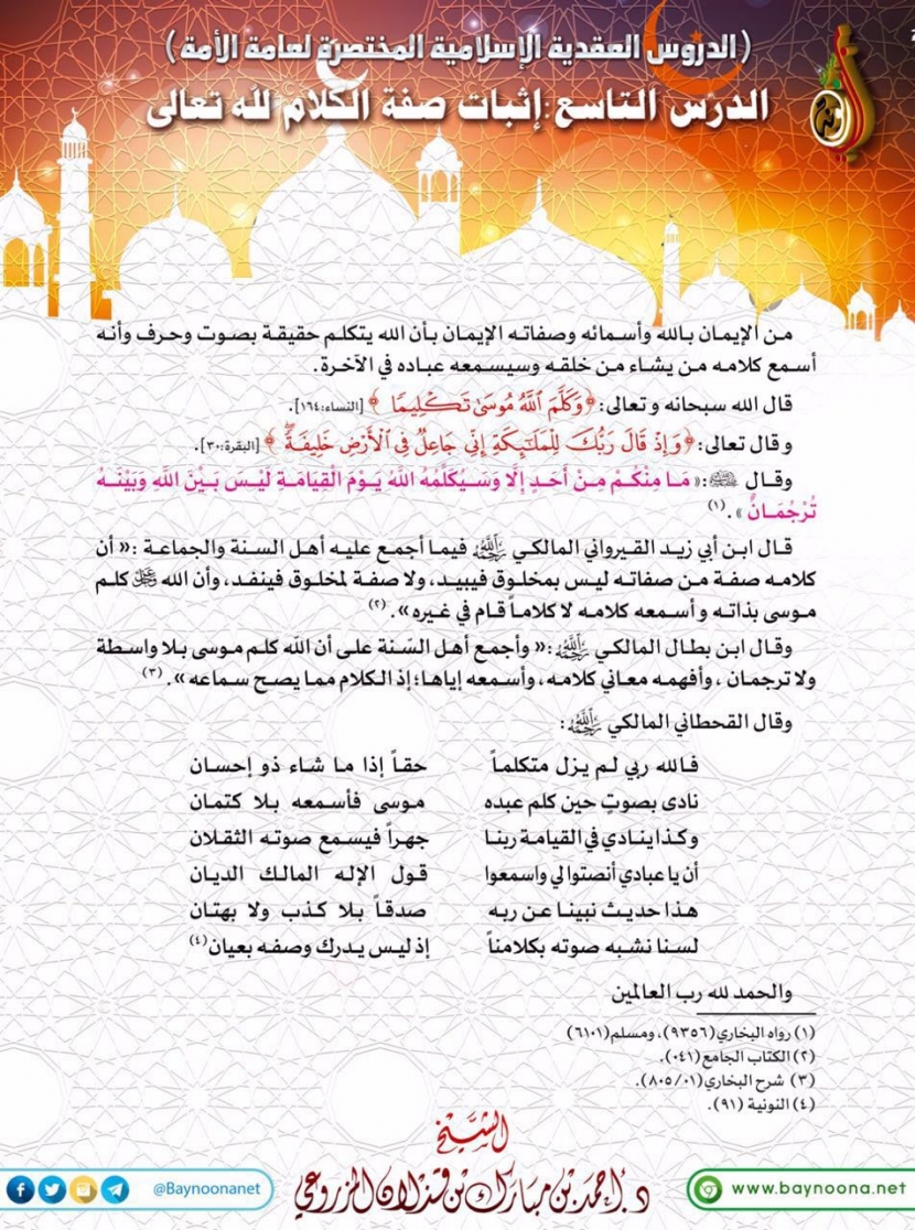 (9) - إثبات صفة الكلام لله تعالى تاريخ الإضافة: الخميس, 07/07/2016 - 21:03 التصنيفات الشيخ: د. أحمد بن مبارك المزروعي