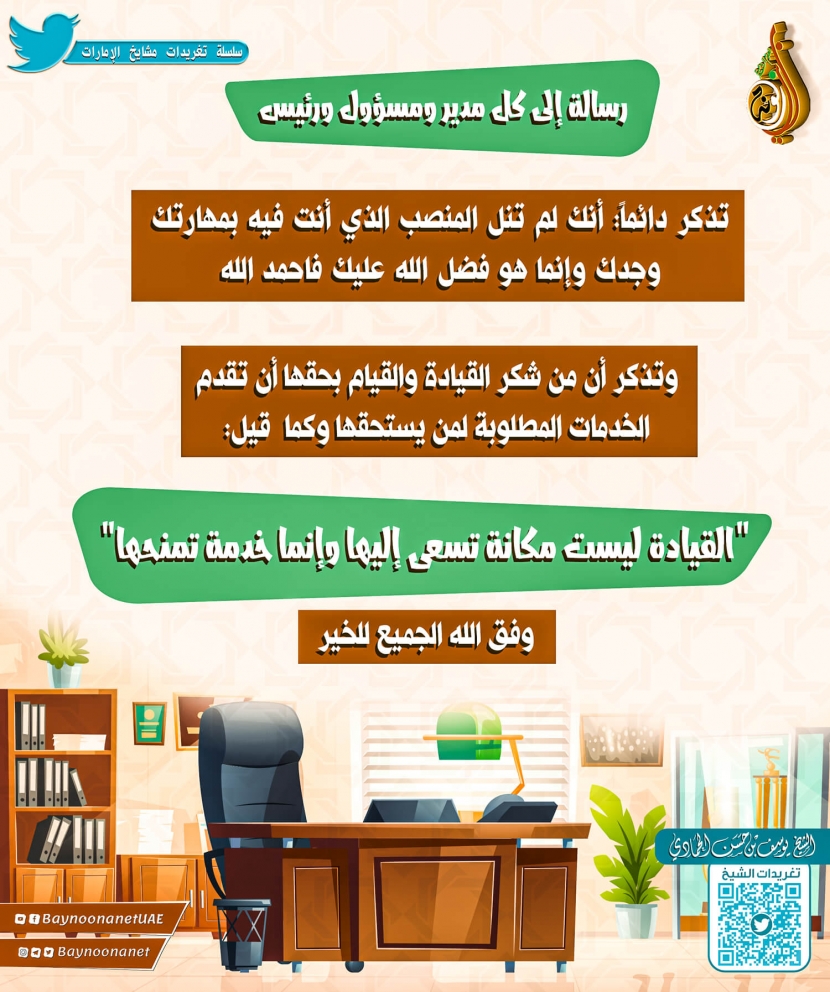 رسالة إلى كل مدير ومسؤول ورئيس تاريخ الإضافة: الثلاثاء, 17/11/2020 - 17:23 التصنيفات الشيخ: يوسف بن حسن الحمادي