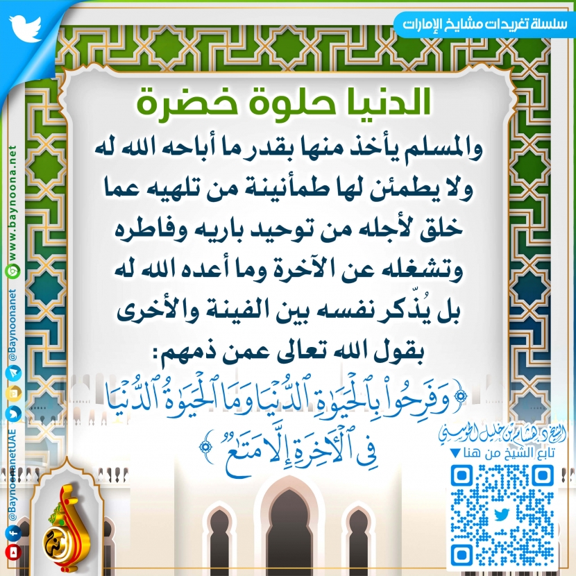 الدنيا حلوة خضرة تاريخ الإضافة: الأربعاء, 10/03/2021 - 02:48 التصنيفات الشيخ: د. هشام بن خليل الحوسني