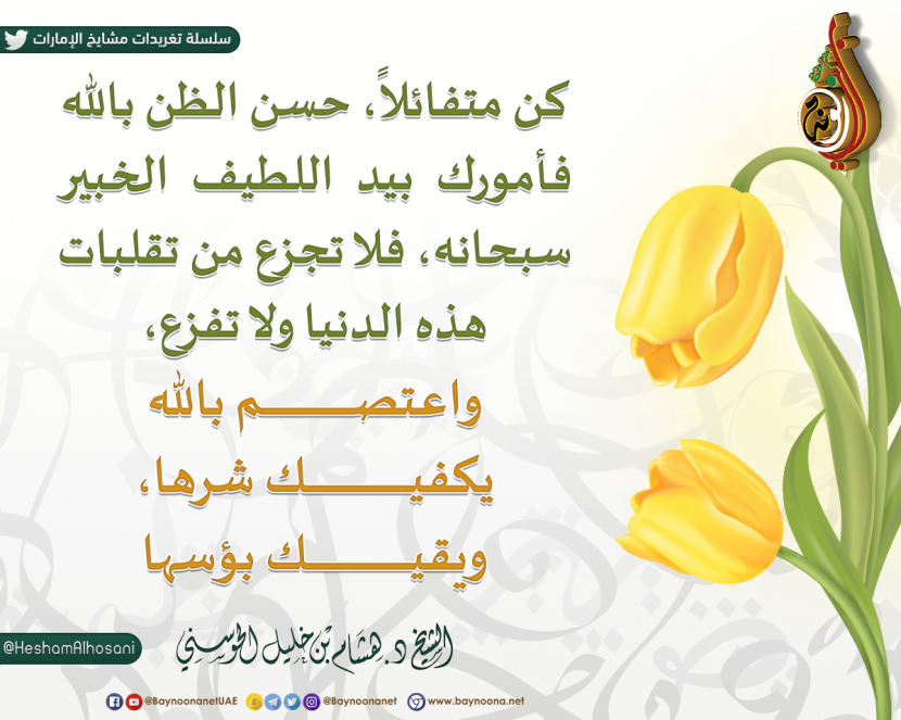 كن متفائلا ، حسن الظن بالله ... تاريخ الإضافة: الخميس, 17/06/2021 - 14:58 التصنيفات الشيخ: د. هشام بن خليل الحوسني