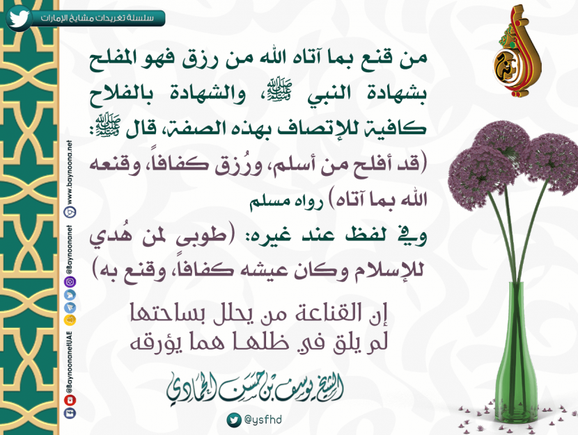 من قنع بما آتاه الله من رزق فهو المفلح ... تاريخ الإضافة: الثلاثاء, 29/06/2021 - 21:56 التصنيفات الشيخ: يوسف بن حسن الحمادي