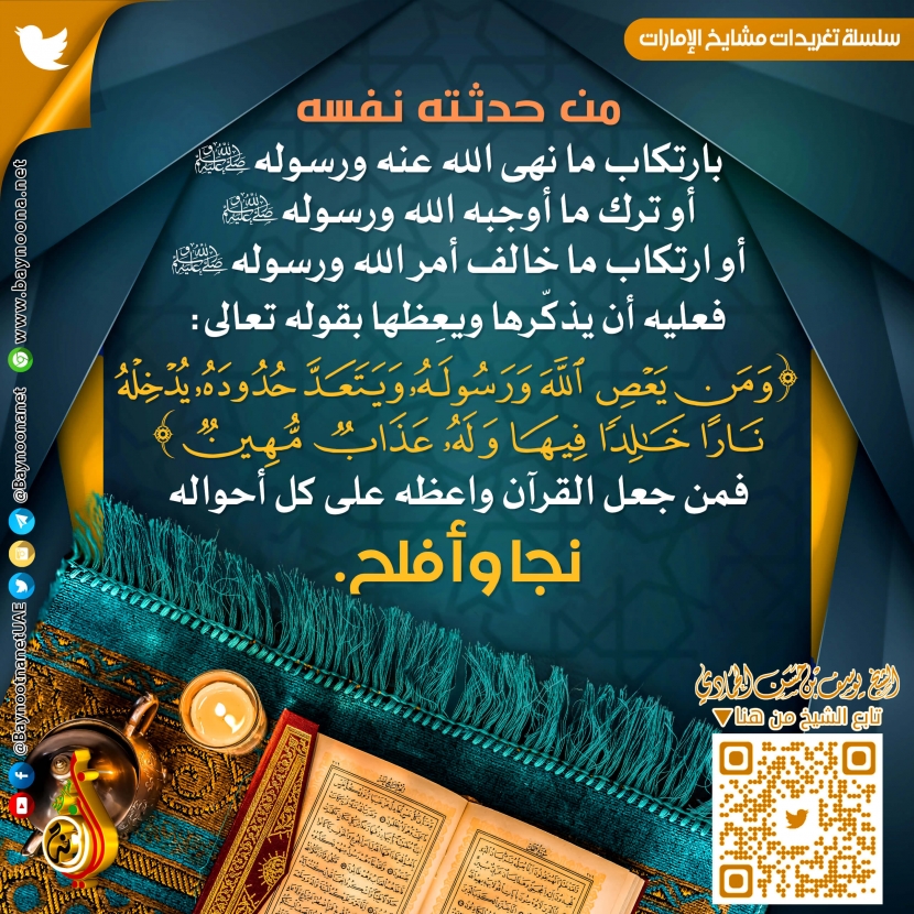 من حدثته نفسه بارتكاب ما نهى الله عنه ... تاريخ الإضافة: الأحد, 18/07/2021 - 01:02 التصنيفات الشيخ: يوسف بن حسن الحمادي